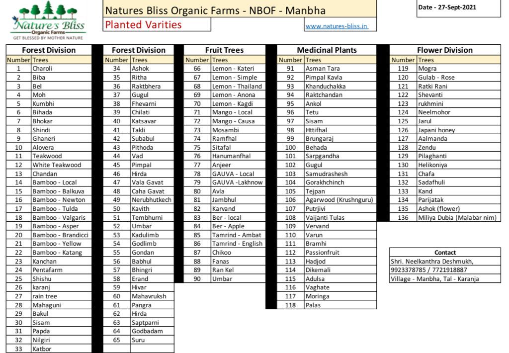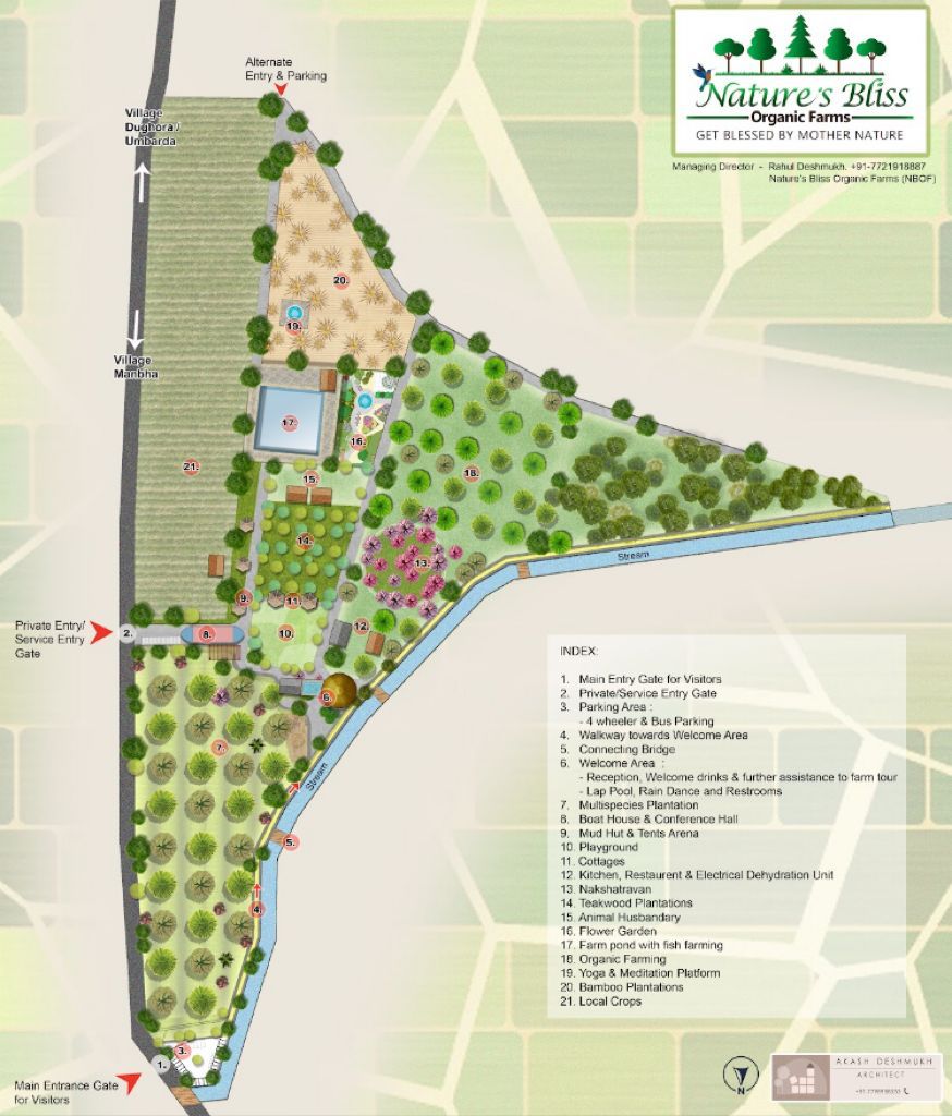 ‘Nature’s Bliss Organic Farms’, take care of healthy heirloom organic Anna (food) and Healthy Nivara (stay with nature) at Manbha village near to Nagpur. Total area of farm is 50 acres with 12 acres of private agroforestry, heirloom organic farm, bamboo farm, medicinal plants etc. of 150 plus different species. Second project is under development which is located 30 km from historical Burhanpur city of Madya Pradesh state under leadership of Dhiraj Pawar. It is spread across 10 acres.